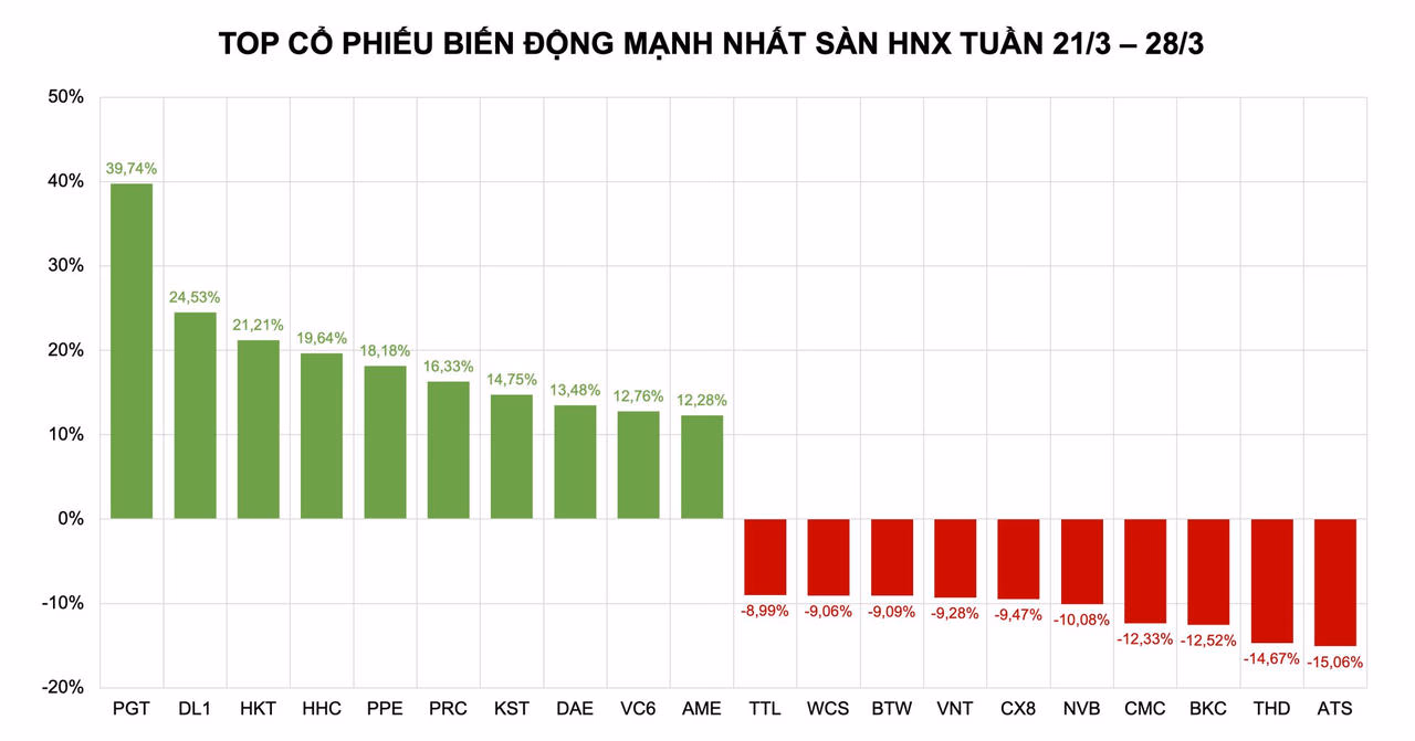 Ngoài hai cái tên kể trên, thị trường còn chứng kiến sự bứt phá của loạt cổ phiếu khác như HKT (+21,21%), IHC (+19,64%), PPE (+18,18%), PRC (+16,33%), KST (+14,75%), DAE (+13,48%), VC6 (+12,76%) và AME (+12,28%). Đáng chú ý, AME có tuần thứ hai liên tiếp lọt nhóm tăng mạnh dù đà tăng có phần chững lại.