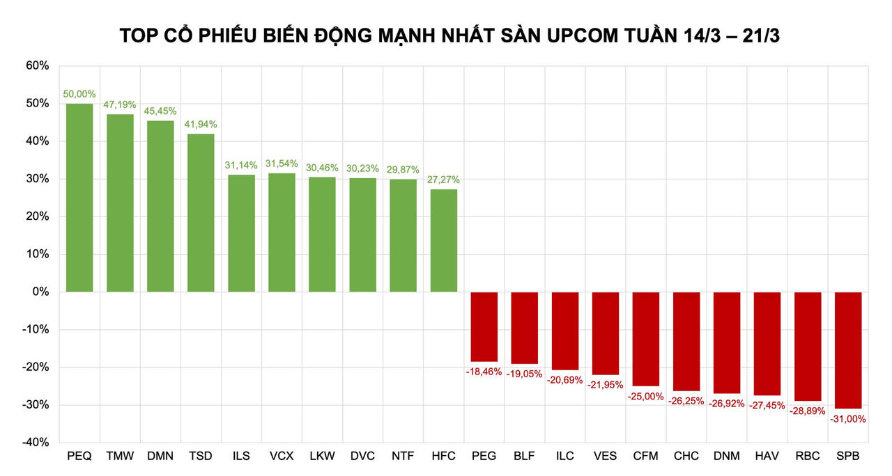 Trên sàn UPCoM, top 10 cổ phiếu tăng mạnh nhất có sự góp mặt của PEQ (+50%), TMW (+47,19%), DMN (+45,45%), TSD +(41,94%), ILS (+32,14%), VCX (+31,54%), LKW (+30,46%), DVC (+30,23%), NTF (+29,87%), HFC (+27,27%)