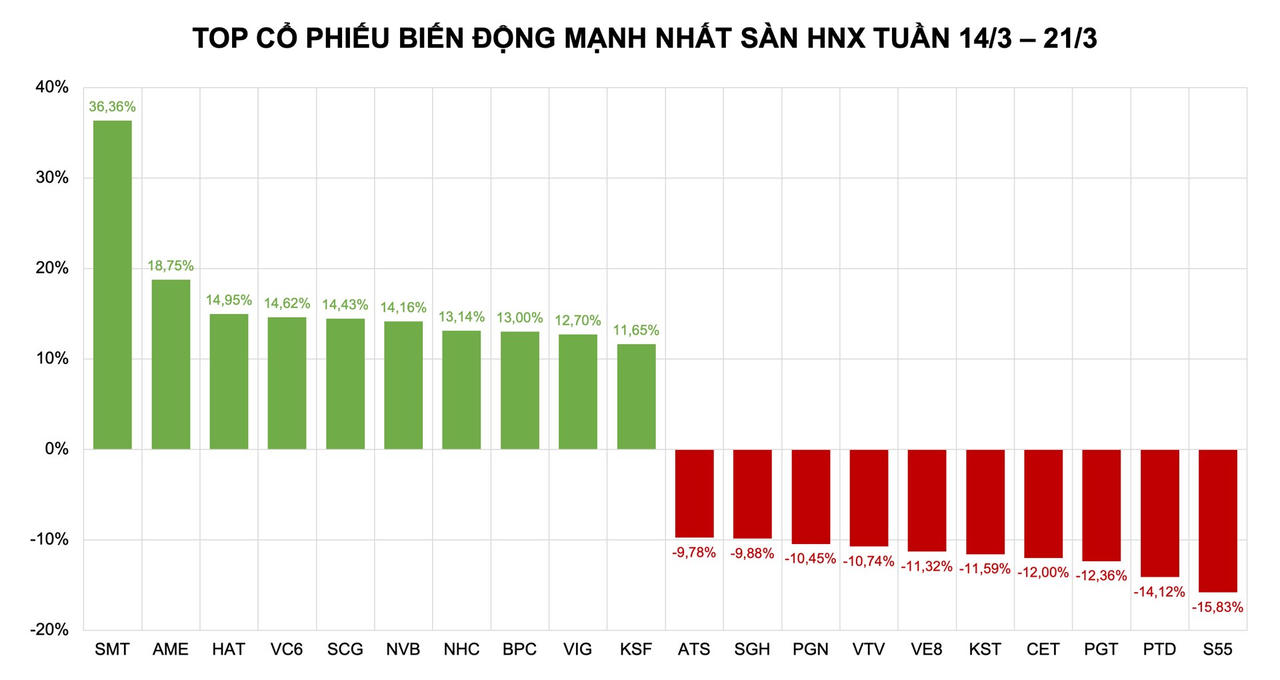 Trên sàn HNX, top 10 cổ phiếu tăng mạnh nhất gọi tên SMT (+36,36%), AME (+18,75%), HAT (+14,95%), VC6 (+14,62%), SCG (+14,43%), NVB (+14,16%), NHC (+13,14%), BPC (+13%), VIG (+12,68%), KSF (+11,65%).