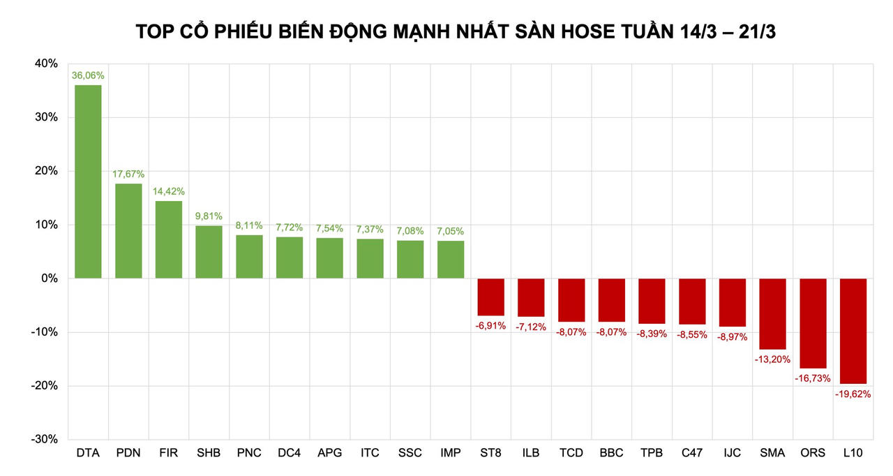 Về phần còn lại, ngoại trừ PDN (+17,67%), FIR (+14,42%), các cổ phiếu tăng mạnh tuần qua chủ yếu dao động trong khoảng 6% đến gần 10%: SHB (+9,81%), PNC (+8,11%), DC4 (+7,72%), APG (+7,54%), ITC (+7,37%), SSC (+7,36%) và IMP (+6,07%).