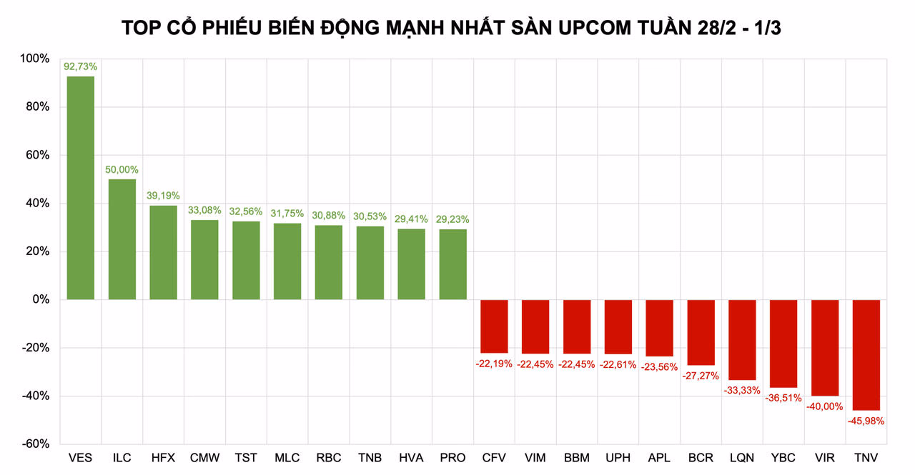 Trên UPCoM, danh sách 10 cổ phiếu tăng mạnh nhất lần lượt gọi tên VES (+92,73%), ILC (+50,00%), HFX (+39,19%), CMW (+33,08%), TST (+32,56%), MLC (+31,75%), RBC (+30,88%), TNB (+30,53%), HVA (+29,41%), PRO (+29,23%)