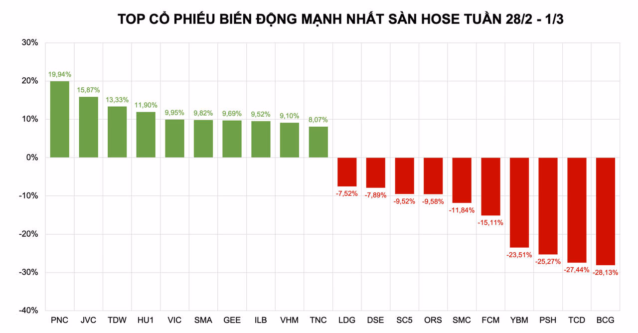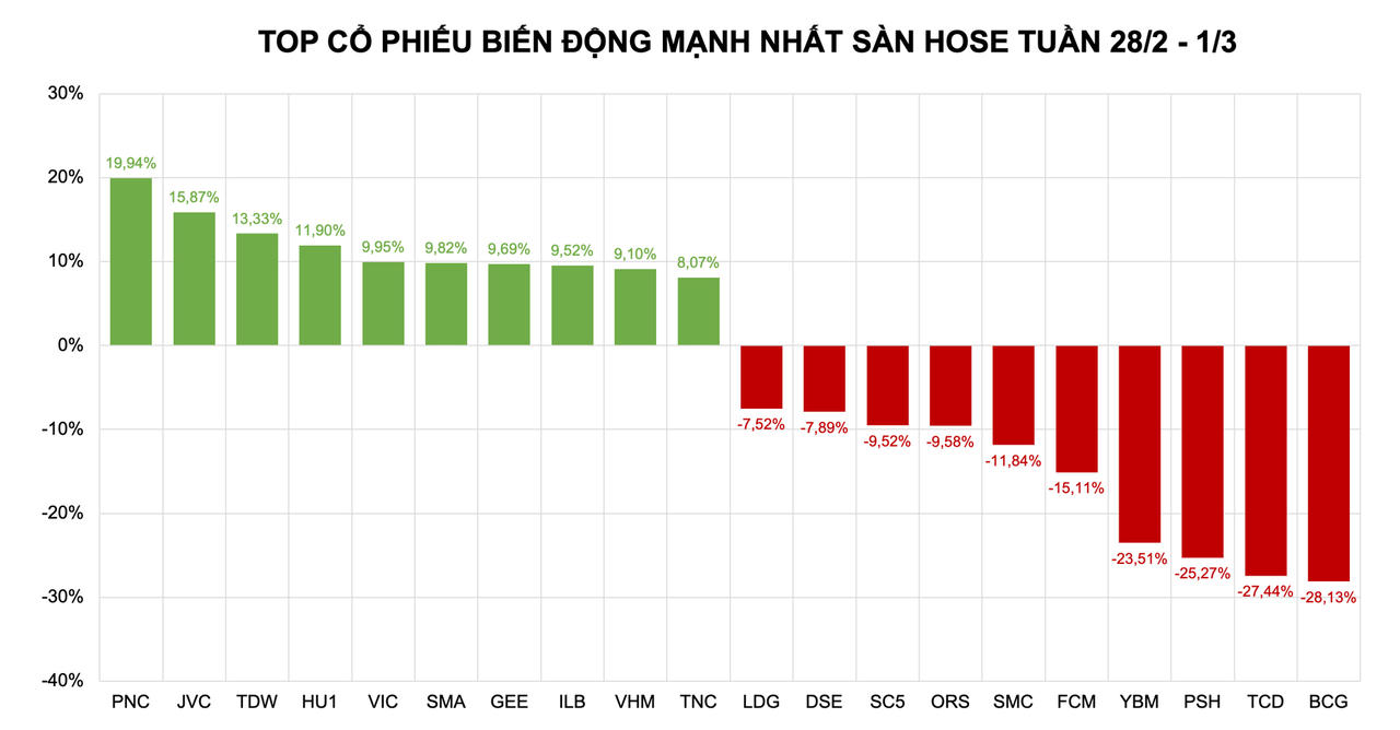 Trên sàn HoSE, top 10 cổ phiếu tăng mạnh nhất lần lượt là PNC (+19,94%), JVC (+15m87%), TDW (+11,90%), HU1 (+9,95%), VIC (+9,82%), SMA (+9,69%), GEE (+9,52%), ILB (+9,10%), VHM (+8,07%).
