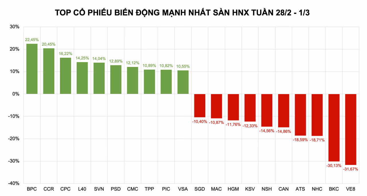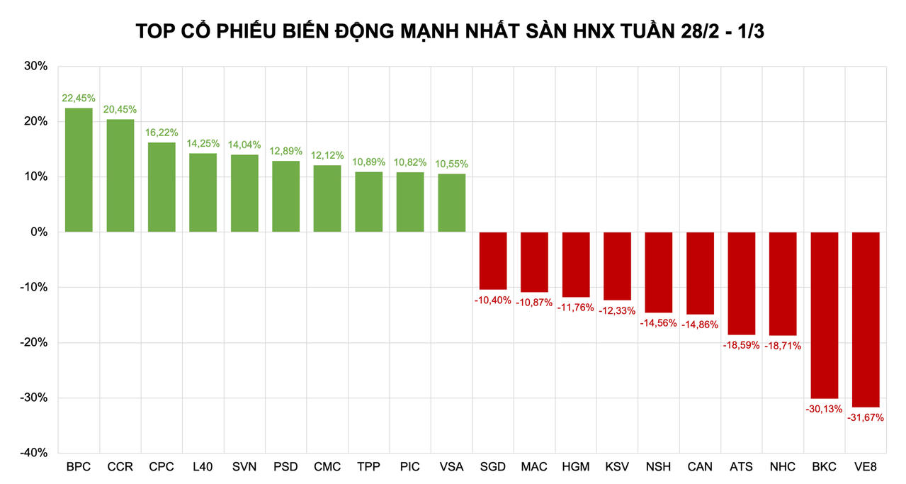 Trên sàn HNX, top 10 cổ phiếu tăng mạnh nhất là BPC (+22,45%), CCR (+20,45%), CPC (+16,22%), L40 (+14,25%), SVN (+14,04%), PSD (+12,89%), CMC (+12,12%), TPP (+10,89%), PIC (+10,82%), VSA (+10,55%).