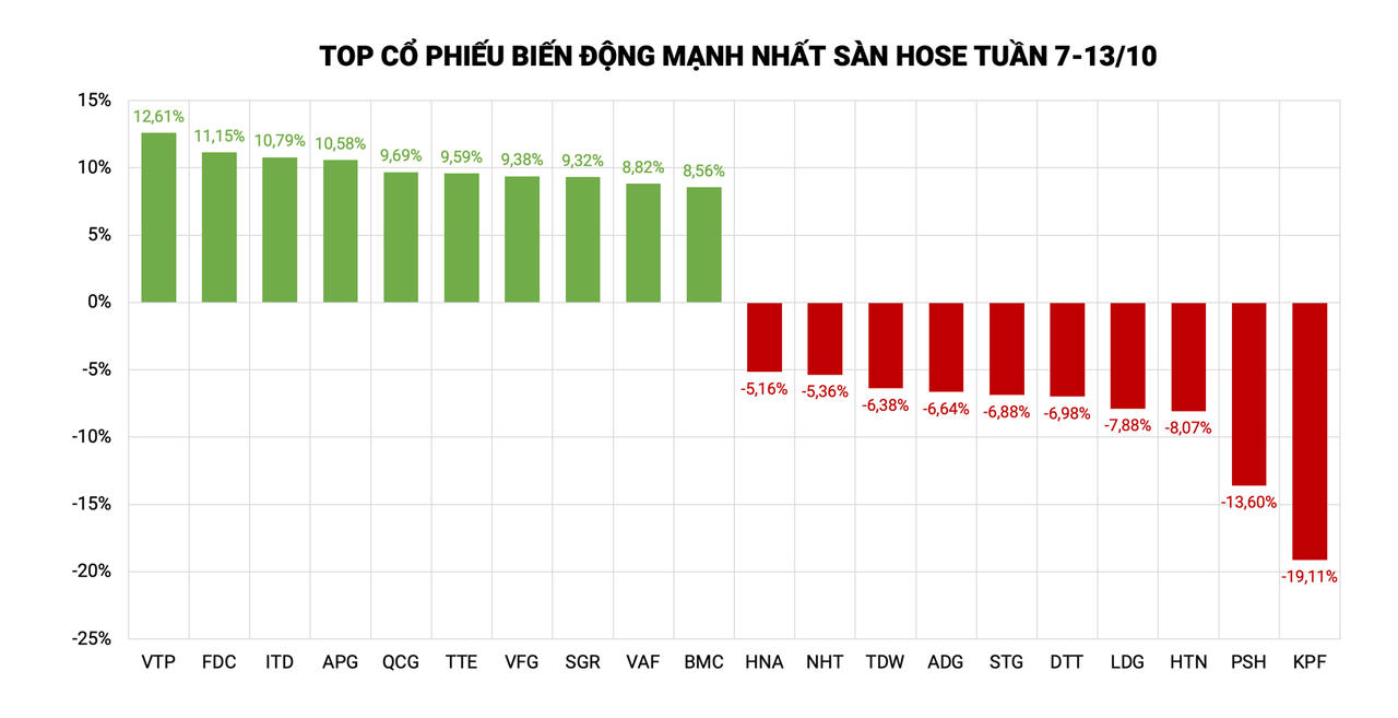 Ở chiều ngược lại, top 10 cổ phiếu giảm mạnh nhất tuần gọi tên PSH (-13,60%), HTN (-8,07%), LDG (-7,88%), DTT (-6,98%), STG (-6,88%), ADG (-6,64%), TDW (-6,38%), D2D (-6,02%), và NHT (-5,35%).