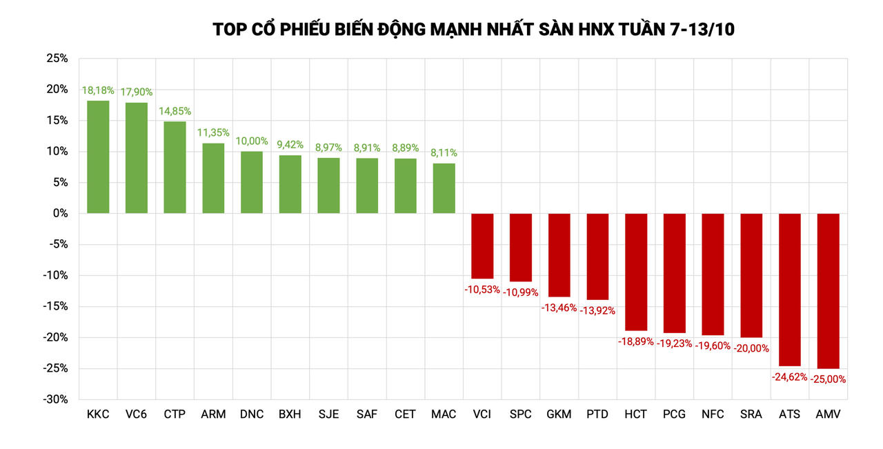 Trên sàn HNX, top 10 cổ phiếu tăng mạnh nhất là KKC (+18,18%), VC6 (+17,90%), CTP (+14,85%), ARM (+11,35%), DNC (+10%), BXH (+9,42%), SJE (+8,97%), SAF (+8,91%), CET (+8,89%), MAC (+8,11%).