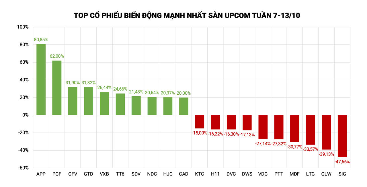 Trên UPCoM, cổ phiếu APP của Công ty CP Phát triển Phụ gia và Sản phẩm Dầu mỏ “bỏ xa” phần còn lại khi tăng kịch trần cả 5 phiên giao dịch. Đóng cửa phiên giao dịch ngày 11/10, mã này đạt 8.500 đồng, tăng 80,85% so với đầu tuần. Cùng với đà tăng phi mã, thanh khoản cũng cải thiện đáng kể khi khớp lệnh vài chục nghìn đến trăm nghìn đơn vị mỗi phiên.