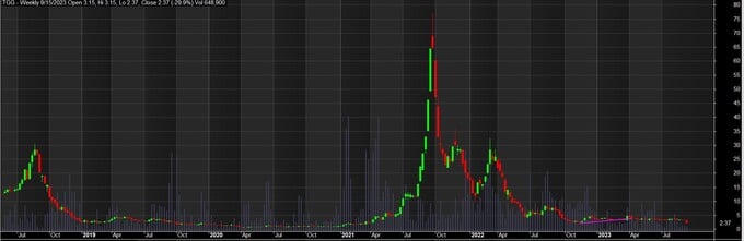 TGG đã bị HOSE đưa vào diện tạm ngừng giao dịch từ ngày 15/9/2023 với giá đóng cửa 2.370 đồng/cổ phiếu, giảm 96,9% kể từ đỉnh lịch sử và giảm 84,5% kể từ khi Đỗ Thành Nhân bị bắt.
