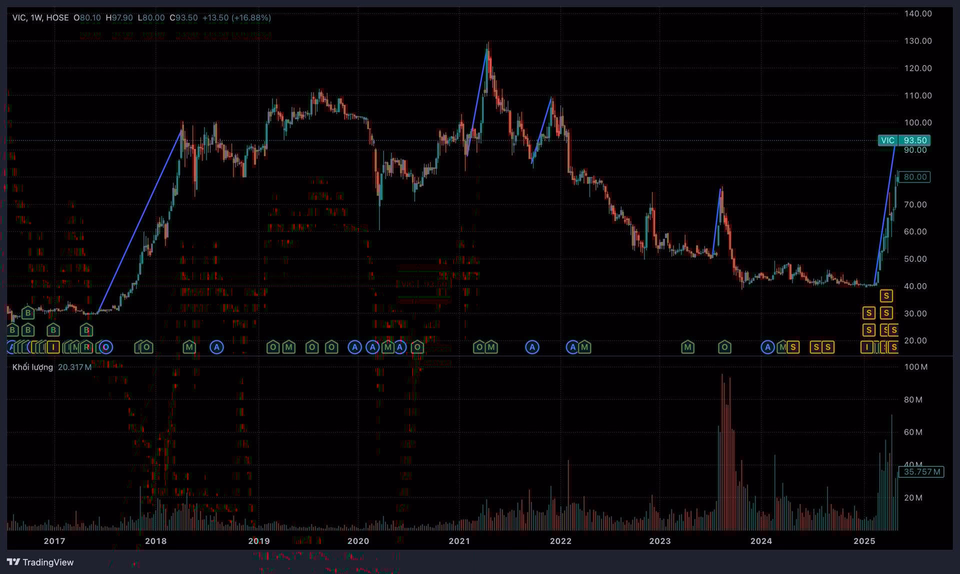 So với đáy gần nhất (39.900 đồng/cp) tại ngày 12/2/2025, cổ phiếu VIC đã tăng tới 133%, mạnh hơn cả giá vàng. Đây được xem minh chứng sống động cho tuyên bố mạnh mẽ của Chủ tịch Vingroup Phạm Nhật Vượng tại ĐHĐCĐ thường niên 2025: “Chọn VIC hay chọn vàng thì chọn VIC là đúng rồi”.