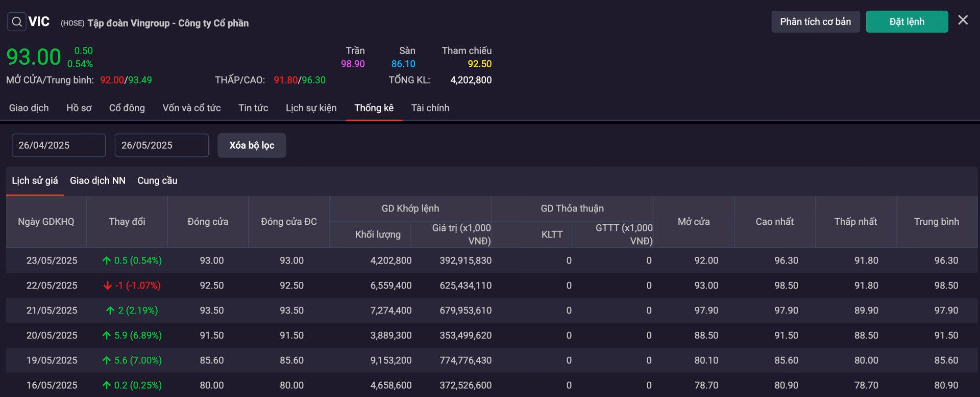 Đỉnh điểm của sự thăng hoa là vào phiên sáng 22/5/2025, khi VIC bật lên 98.400 đồng/cp, đưa vốn hoá thị trường của Vingroup chạm ngưỡng 380.000 tỷ đồng, tương đương 14,5 tỷ USD. Tuy nhiên, áp lực chốt lời gia tăng trong chiều hôm đó đã khiến mã này quay đầu, giảm 1% so với tham chiếu.
