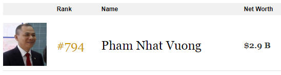 Theo thống kê của Forbes, tài sản tính đến ngày 5/10/2017 của ông Phạm Nhật Vượng là 2,9 tỷ USD - tăng thêm nửa tỷ USD trong 6 tháng qua (hồi tháng 3/2017, số liệu của Forbes là 2,4 tỷ USD). Ông Vượng xếp thứ 794 trong danh sách hiện tại - tăng 73 bậc so với tháng 3/2017.