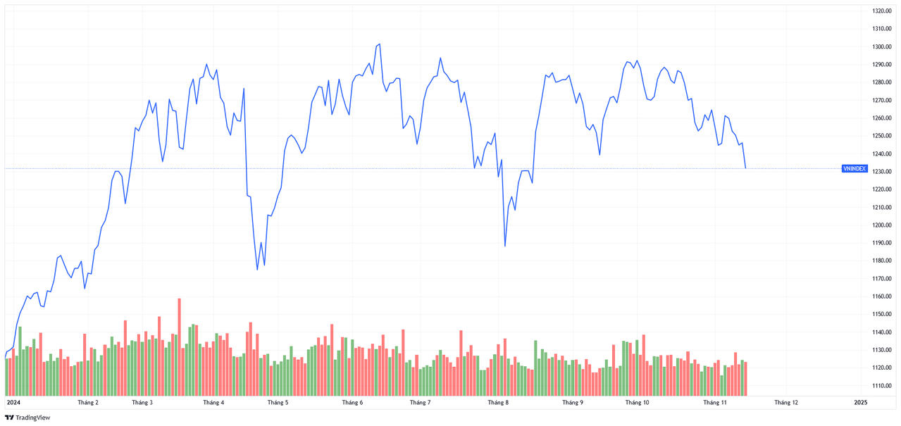 Phiên 14/11, chỉ số VN-Index giảm tới hơn 14 điểm, qua đó thủng sâu mốc quan trọng 1.240 điểm, kết phiên ở 1.231,89 điểm. Nhìn vào đồ thị VN-Index, có thể thấy chỉ riêng trong năm 2024, các nhà đầu tư đã phải leo qua… "3 quả đồi" và đến thời điểm bây giờ đã hết sức mệt mỏi và chán nản.