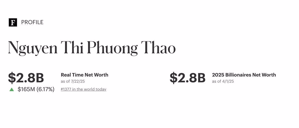 Theo bảng xếp hạng của Forbes, tài sản của tỷ phú Nguyễn Thị Phương Thảo đang ở mức 2,8 tỷ USD và là người giàu thứ 1.377 trên thế giới, tăng thêm so với ngày trước đó là 165 triệu USD.