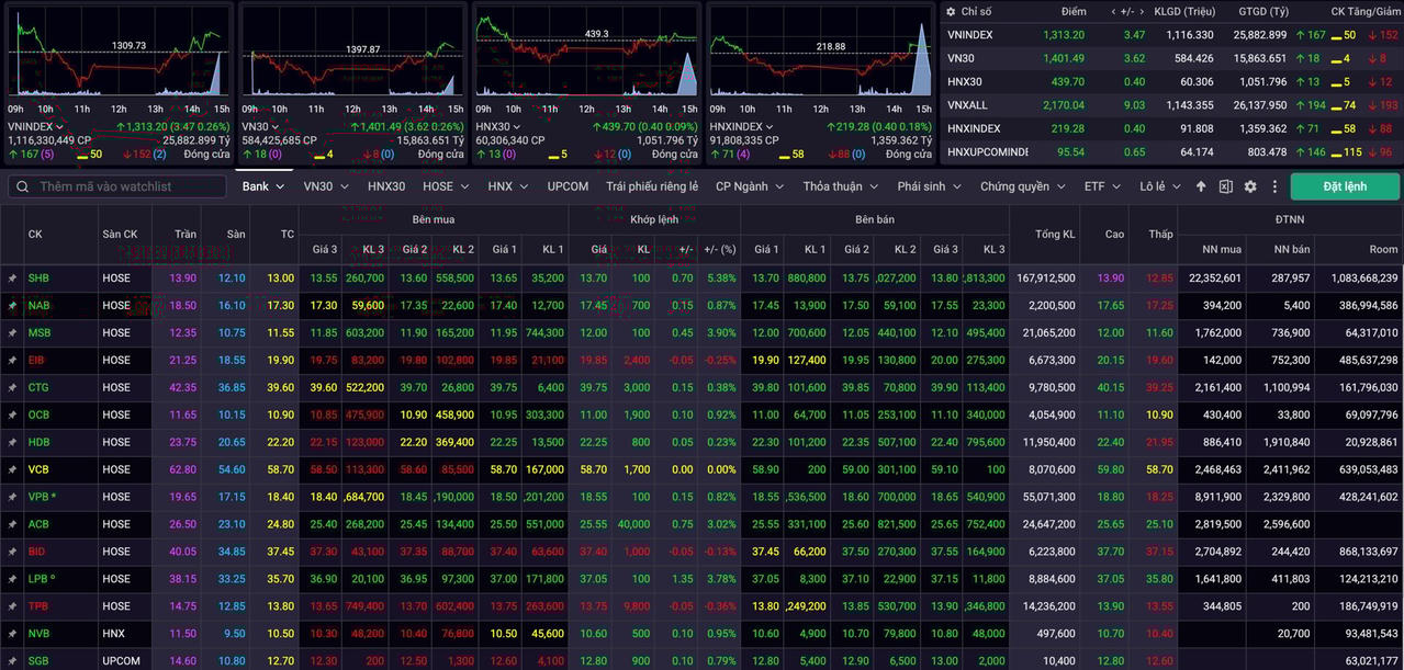 Dù chịu áp lực điều chỉnh trong phiên sáng, thị trường chứng khoán vẫn đóng cửa trong sắc xanh. Chốt phiên, chỉ số VN-Index tăng 3,47 điểm, lên mức 1.313 điểm. Thanh khoản toàn thị trường tuy có phần suy giảm so với phiên trước nhưng vẫn ở mức cao, với tổng giá trị giao dịch vượt 28.000 tỷ đồng, tương đương hơn 1 tỷ USD. Trong đó, sàn HoSE ghi nhận giá trị giao dịch đạt 25.883 tỷ đồng.