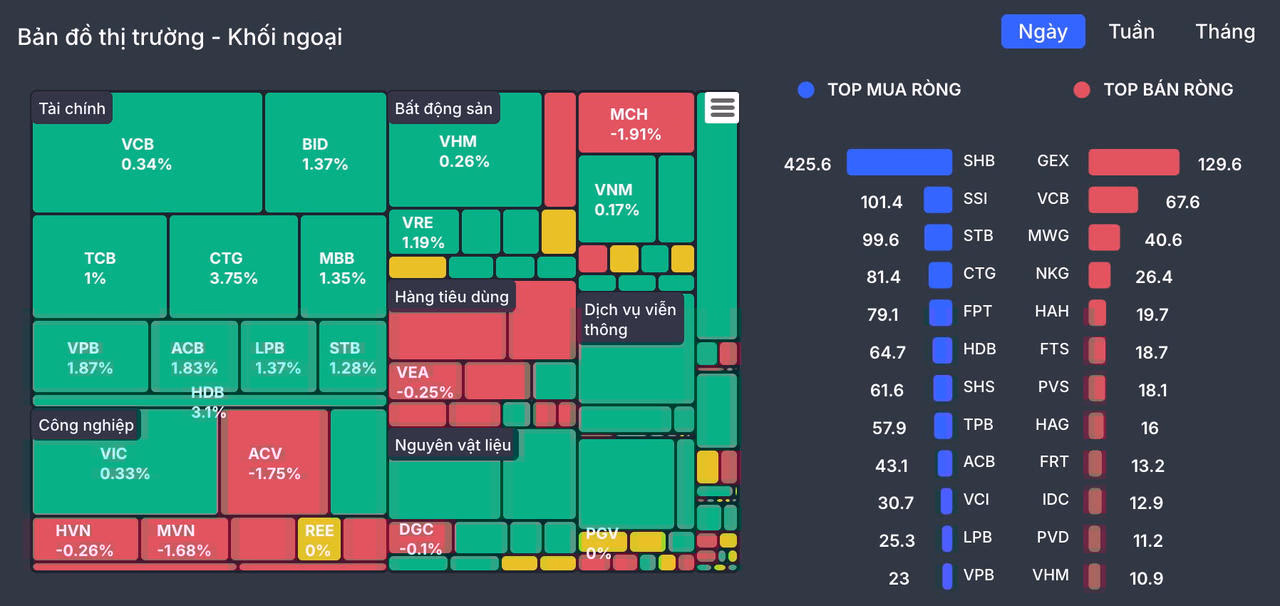 Đáng chú ý, nhóm cổ phiếu tài chính không chỉ hấp dẫn nhà đầu tư trong nước mà còn thu hút sự quan tâm lớn từ khối ngoại. Trong phiên sáng, nhà đầu tư nước ngoài mua ròng tổng cộng 566 tỷ đồng. Các mã được gom mạnh gồm SHB (+425,6 tỷ đồng), SSI (+101,4 tỷ đồng), STB (+99,6 tỷ đồng) và CTG (+81,4 tỷ đồng).