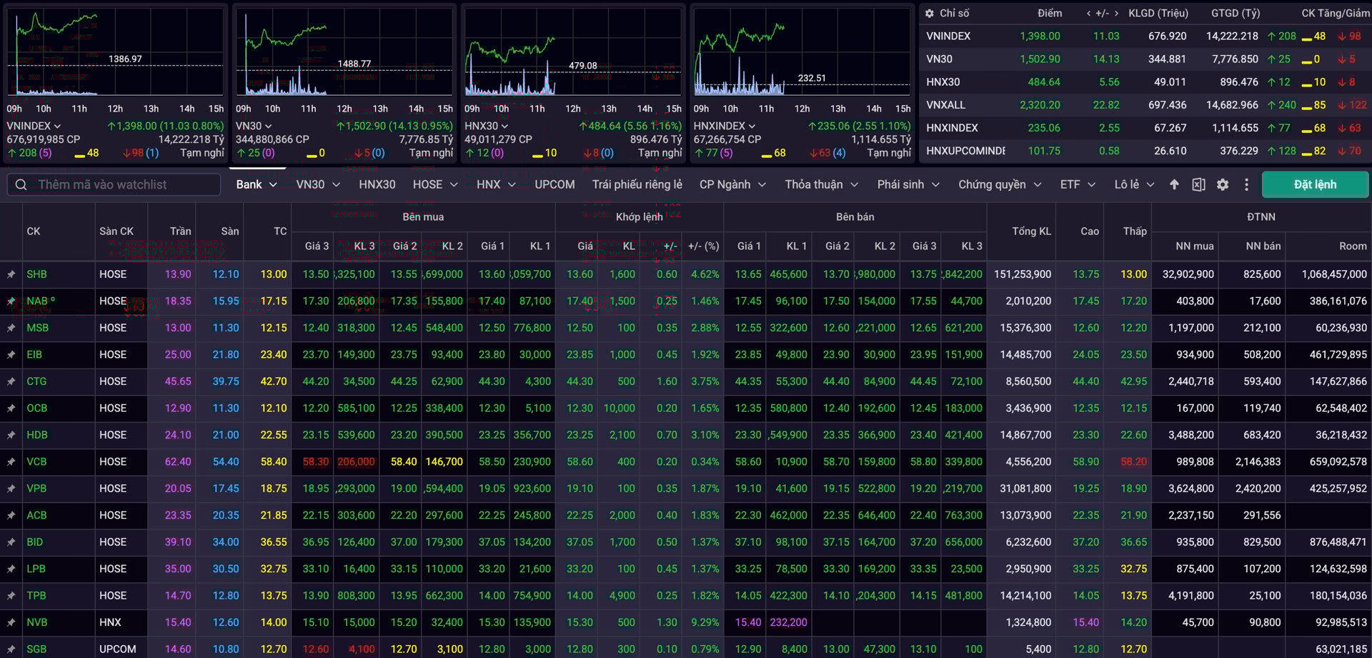 Thanh khoản toàn thị trường tăng vọt, đạt hơn 15.600 tỷ đồng, trong đó sàn HoSE đóng góp khoảng 14.222 tỷ đồng – cho thấy dòng tiền vẫn tập trung mạnh vào các cổ phiếu vốn hóa lớn. Trên sàn HoSE, có 208 mã tăng giá, 48 mã đứng giá và 98 mã giảm. Sàn HNX có 77 mã tăng, 68 mã đi ngang và 63 mã giảm. Trên UPCoM, số lượng cổ phiếu tăng giá cũng áp đảo với 128 mã, còn lại có 82 mã đứng giá và 70 mã giảm.