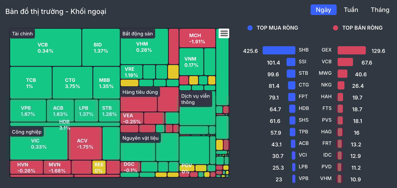 Đáng chú ý, nhóm cổ phiếu tài chính không chỉ hấp dẫn nhà đầu tư trong nước mà còn thu hút sự quan tâm lớn từ khối ngoại. Trong phiên sáng, nhà đầu tư nước ngoài mua ròng tổng cộng 566 tỷ đồng. Các mã được gom mạnh gồm SHB (+425,6 tỷ đồng), SSI (+101,4 tỷ đồng), STB (+99,6 tỷ đồng) và CTG (+81,4 tỷ đồng).