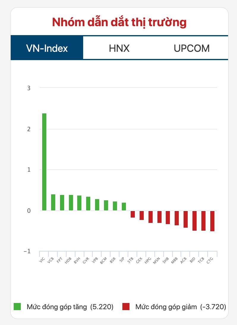 Trong rổ VN30, BVH và VIC trở thành điểm sáng khi bật tăng gần 5%. Hai mã này cũng thu hút mạnh mẽ dòng tiền với thanh khoản vượt ngưỡng trung bình 10 phiên. Theo sau là FPT, HDB, BCM, GVR… với mức tăng ổn định từ 1% đến 2%.