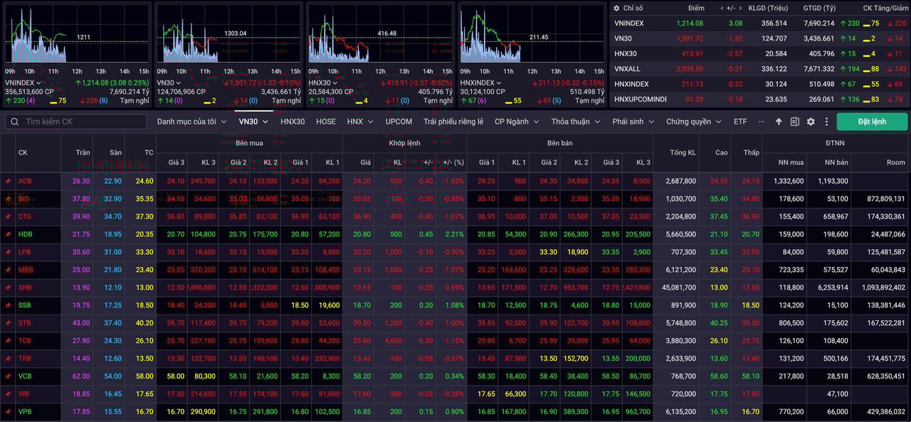 Mở cửa phiên giao dịch sáng 24/4, thị trường chứng khoán tăng gần 10 điểm. Tuy nhiên, sau đà hưng phấn, lực cầu bắt đầu chững lại khi dòng tiền có tín hiệu thận trọng hơn. Theo đó, khép lại phiên sáng, chỉ số VN-Index chỉ tăng nhẹ 3 điểm, dừng ở mức 1.214 điểm. Thanh khoản trên sàn HoSE đạt hơn 7.700 tỷ đồng, thấp hơn đáng kể so với phiên trước đó, phản ánh tâm lý dè dặt của nhà đầu tư.
