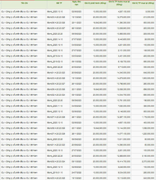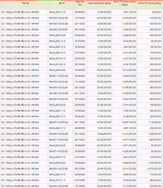 Riêng trong tháng 4,5,6, số lần mua lại trái phiếu của IDJ lên đến 31 đợt với quy mô mỗi đợt mua lại khoảng vài triệu đến vài trăm hoặc khoảng vài tỷ đồng. Hầu hết trái phiếu của IDJ mua lại thời gian gần đây đều đáo hạn vào năm 2023 tức còn khoảng trên dưới 1 năm nữa mới đến ngày đáo hạn. Đa phần trái phiếu phát hành vào năm 2020, một số ít phát hành năm 2019.