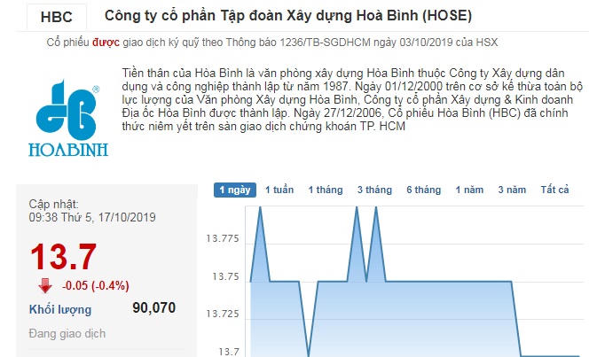 Cổ phiếu HBC của Công ty CP Tập đoàn Xây dựng Hòa Bình sau khi lập đỉnh vào ngày 1/7/2017 với giá 35.000 đồng/CP, hiện tại chỉ đang được giao dịch quanh mức 13.700 đồng/CP - mức đáy giao dịch trong vòng 3 năm gần đây.