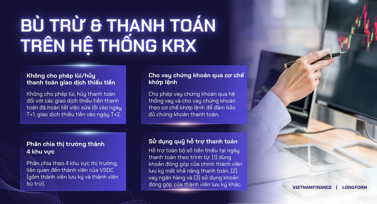 Cụ thể, KRX không cho phép lùi, hủy thanh toán đối với các giao dịch thiếu tiền thanh toán đã hoàn tất việc sửa lỗi vào ngày T+1, giao dịch thiếu tiền vào ngày T+2 - điều vẫn được chấp nhận trên hệ thống hiện hành. Thay vào đó, để đảm bảo đủ chứng khoán thanh toán, hệ thống công nghệ này cho phép thực hiện vay và cho vay chứng khoán theo cơ chế khớp lệnh - điều mà hệ thống hiện hành chưa đáp ứng được.