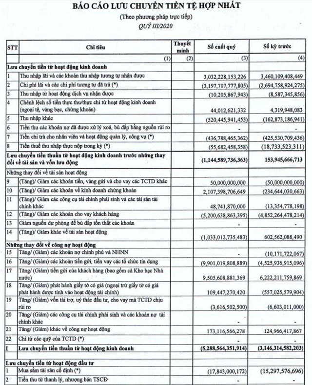 Chưa kể nhìn vào BCTC hợp nhất quý 3/2020, có thể thấy chất lượng sử dụng nguồn tiền của VietABank cũng gặp vấn đề khi ghi nhận nhiều con số âm. Cụ thể, dòng tiền thuần từ hoạt động kinh doanh của ngân hàng âm hơn 5.288 tỷ đồng; lưu chuyển tiền thuần trong kỳ ghi nhận âm gần 4.142 tỷ đồng,…