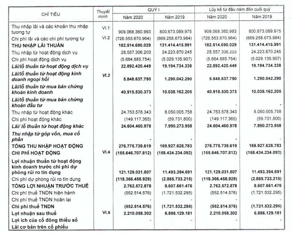Hay tại ngân hàng TMCP Bảo Việt (BaoViet Bank), hiện vẫn chưa công bố báo cáo tài chính hợp nhất quý 3/2020 nhưng theo số liệu báo cáo tài chính quý 1/2020 cho thấy kết quả kinh doanh và chất lượng tín dụng không mấy sáng sủa.