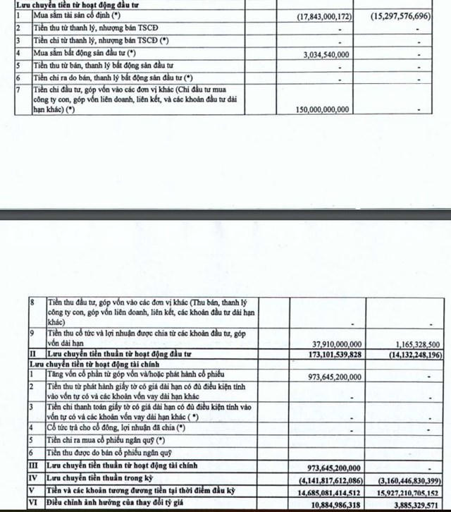 Cụ thể, dòng tiền thuần từ hoạt động kinh doanh âm hơn 5.149 tỷ đồng; dòng tiền thuần từ hoạt động đầu tư âm 23,8 tỷ đồng trong khi cùng kỳ âm hơn 15,7 tỷ đồng; lưu chuyển tiền thuần trong kỳ ghi nhận âm hơn 5.173 tỷ đồng,…