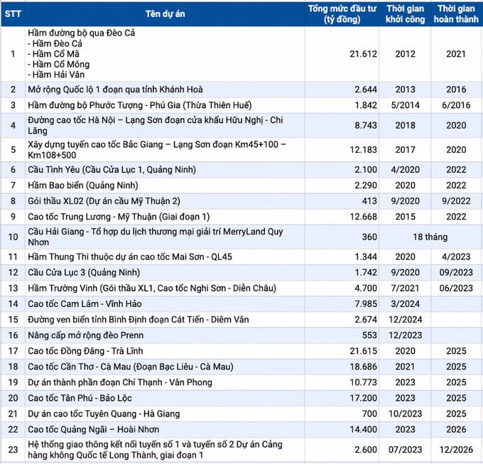Theo danh mục công trình được cập nhật trên website của Đèo Cả, từ đầu năm đến nay, Tập đoàn này đã hoàn thành 3 dự án lớn, đó là hầm Thung Thi (Cao tốc Mai Sơn - Quốc lộ 45), cầu Cửa Lục 3 (Quảng Ninh) và hầm Trường Vinh (Cao tốc Nghi Sơn - Diễn Châu).