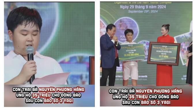 Đáng nói, cũng trong lần xuất hiện này, con trai bà Nguyễn Phương Hằng cũng đã dành toàn bộ số tiền được tặng trong dịp sinh nhật lần thứ 12 của mình để ủng hộ đồng bào bị ảnh hưởng bởi cơn bão Yagi với số tiền ủng hộ 35.500.000 đồng.