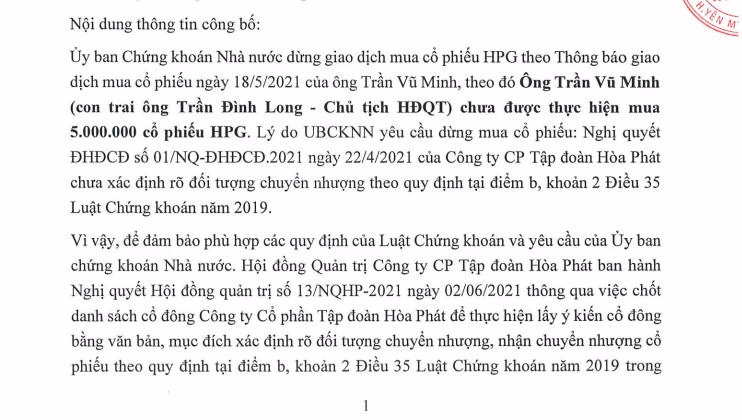 Được biết nguyên nhân Ủy ban Chứng khoán Nhà nước đưa ra là tại Nghị quyết Đại hội cổ đông ngày 22/4 của Tập đoàn Hòa Phát (mã: HPG) chưa xác định rõ đối tượng chuyển nhượng theo quy định tại điểm b, khoản 2, Điều 35 của Luật Chứng khoán 2019.