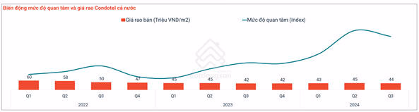 Trang rao tin Batdongsan thống kê loại hình căn hộ khách sạn (condotel) đang có mức độ quan tâm tăng đáng kể vào giữa năm 2024. Giá bán đang trên đà hồi phục, dao động từ 40 triệu đồng/m2 đến hơn trăm triệu đồng/m2 trong 3 quý đầu năm 2024.