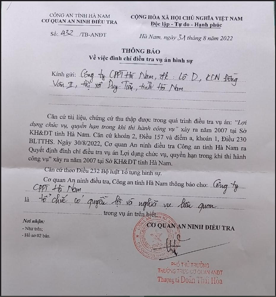 Ngày 31/8/2022, Cơ quan An ninh điều tra Công an tỉnh Hà Nam đã ban hành văn bản số 432/TB-ANĐT thông báo về việc đình chỉ điều tra vụ án hình sự “Lợi dụng chức vụ quyền hạn trong khi thi hành công vụ” xảy ra năm 2007 tại Sở Kế hoạch – Đầu tư tỉnh Hà Nam do hành vi không cấu thành tội phạm.