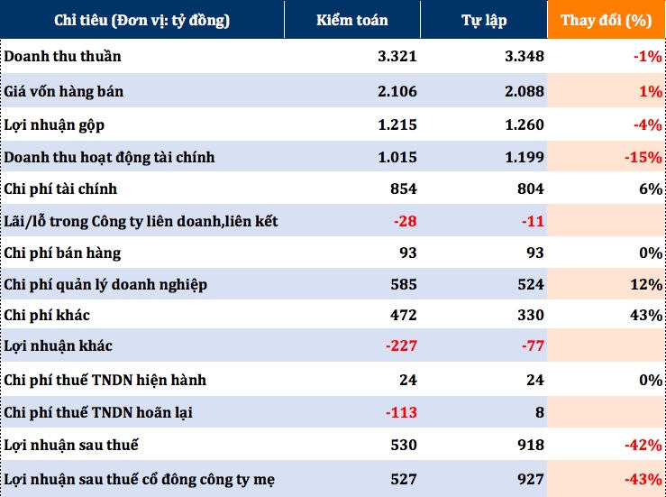 Đây đều là những khoản mục được điều chỉnh trên báo cáo kết quả kinh doanh sau kiểm toán của HAGL Agrico. Trong đó, doanh thu thuần chỉ giảm nhẹ 27 tỷ đồng nhưng khoản lợi nhuận sau thuế cổ đông công ty mẹ giảm 43% còn 527 tỷ đồng. Còn lợi nhuận sau thuế cũng giảm 42% còn 530 tỷ đồng.