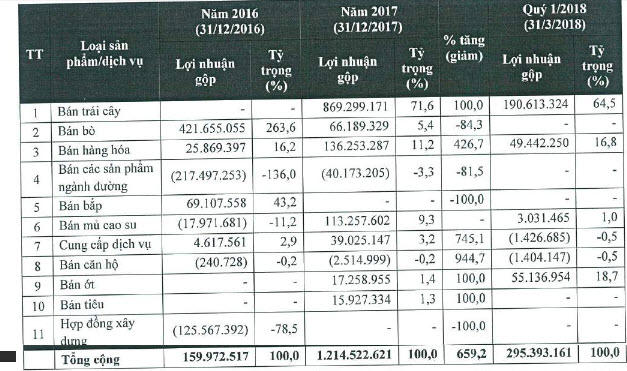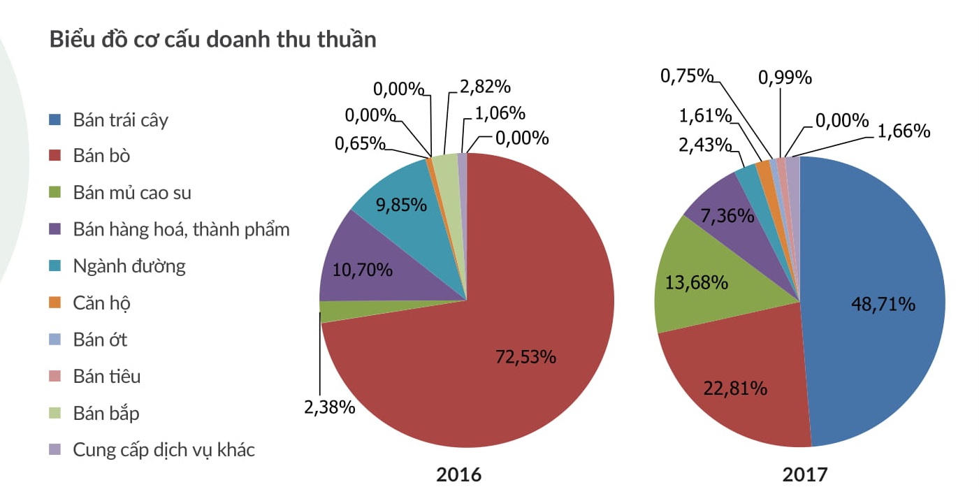 Đến năm 2017, đóng góp lớn nhất cho doanh thu lại đến từ ngành trái cây, tỷ lệ đóng góp là 48.71%; ngành chăn nuôi bò đứng thứ hai với tỷ lệ 22.81%. Bên cạnh đó tình hình ngành cao su cải thiện rõ rệt khi doanh thu ngành tăng 298.47% so với cùng kỳ, đóng góp 13.68% vào tổng doanh thu. Đứng thứ tư là doanh thu đến từ bán hàng hoá và thành phẩm, đóng góp 7.36% vào tổng doanh thu.