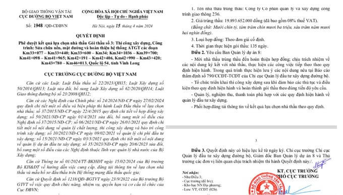 Ngày 15/4/2024, ông Nguyễn Xuân Ảnh - Phó cục Trưởng Cục Đường bộ Việt Nam (Bộ GTVT) ký quyết định lựa chọn nhà thầu tại Gói thầu số 3: Thi công xây dựng, Công trình: Sửa chữa nền, mặt đường và hoàn thiện hệ thống ATGT các đoạn Km33+077 – Km33+440; Km33+600 – Km34; Km34+1036 – Km39+700; Km41+098 – Km41+965; Km42+191 – Km42+406, Km42+990 – Km43+420; Km43+780 – Km46+013, Quốc lộ 54, tỉnh Vĩnh Long. Theo đó, đơn vị trúng thầu là nhà thầu Xây dựng Công trình Giao thông 236 với giá hơn 19,8 tỷ đồng; giá gói thầu hơn 22,6 tỷ đồng.
