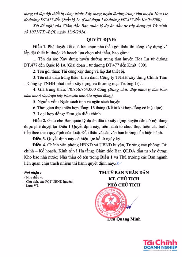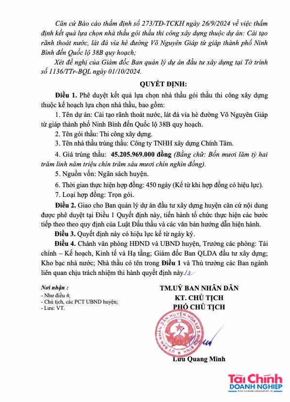 Đơn cử, ngày 1/10/2024, ông Lưu Quang Minh - Phó chủ tịch UBND huyện Hoa Lư đã ký quyết định số 1453/QĐ-UBND phê duyệt cho Công ty Chính Tâm đã trúng gói thầu: Cải tạo rãnh thoát nước, lát đá vỉa hè đường Võ Nguyên Giáp từ TP Ninh Bình đến Quốc lộ 38B quy hoạch. Giá gói thầu: 46.044.365.000 VND, giá trúng thầu: 45.205.969.000 đồng, thời gian thực hiện 450 ngày. Gói thầu do BQLDA đầu tư xây dựng huyện Hoa Lư làm chủ đầu tư.