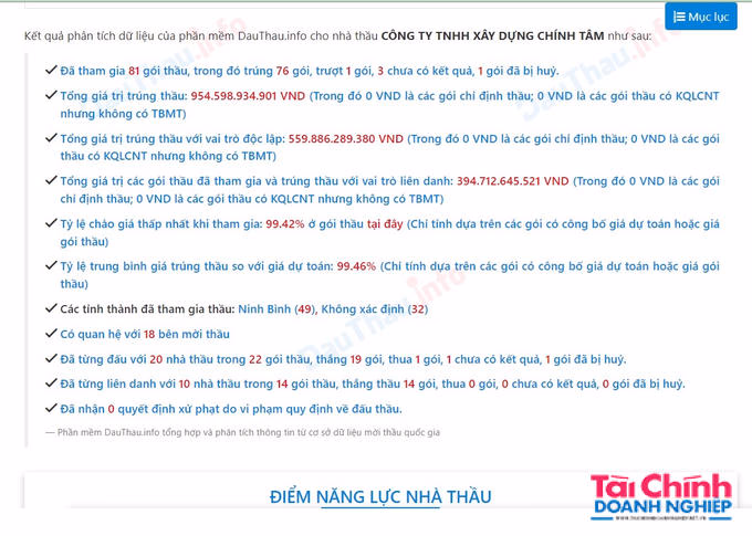 Tính đến tháng 10/2024, Công ty Chính Tâm đã tham gia khoảng 81 gói thầu, trong đó trúng 76 gói. Tổng giá trị trúng thầu khoảng hơn 954 tỷ đồng. Điều đáng nói, dù trúng thầu ở vai trò liên danh hay độc lập, thì những gói thầu do Công ty Chính Tâm trúng đều có tỷ lệ tiết kiệm siêu thấp.