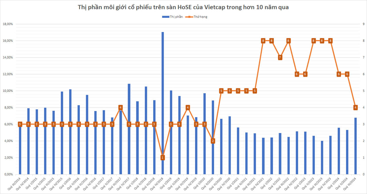 Nhìn lại, Vietcap từng thường xuyên ở trong Top 3 thị phần môi giới cổ phiếu trên sàn HoSE, thậm chí có quý vươn lên vị trị quán quân (quý IV/2018) nhưng cho tới quý III/2020 đã bị đẩy xuống vị trí thứ 5 trước áp lực từ VNDIRECT và VPS. Tới quý IV/2021, Vietcap thậm chí còn bị đẩy xuống vị trí thứ 8. Việc thị phần môi giới của công ty chứng khoán này bất ngờ tăng vọt trong quý vừa qua đã khiến không ít nhà đầu tư bất ngờ.