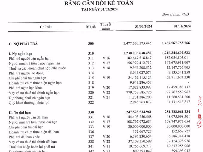 Đáng chú, quý I/2024, công ty Chương Dương lợi nhuận sau thuế chỉ ghi nhật đạt hơn 705 tỷ đồng trong khi cùng kỳ năm 2023 ghi nhận đạt hơn 2,4 tỷ đồng. Trong khi đó, nợ phải trả ghi nhận gần 1.480 tỷ đồng, trong đó nợ ngắn hạn ghi nhận hơn 1.230 tỷ đồng, trong đó thuế và các khoản phải nộp cho nhà nước gần 10 tỷ đồng, phải trả cho người lao động hơn 5 tỷ đồng, quỹ khen thưởng và phuc lợi gần 3 tỷ đồng, vay và thuê tài chính ngắn hạn hơn 779 tỷ đồng… Nợ dài hạn ghi nhận hơn 247 tỷ đồng, trong đó thuế thu nhập hoãn lại phải trả hơn 19,7 tỷ đồng, vay và thuê nợ tài chính dài hạn hơn 37 tỷ đồng…