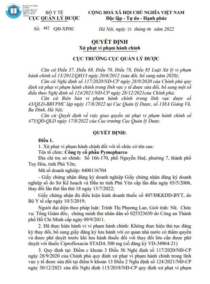 Cục Quản lý Dược (Bộ Y tế) đã ký quyết định xử phạt vi phạm hành chính đối với Công ty cổ phần Pymepharco vì không thực hiện thủ tục đăng ký thay đổi, bổ sung giấy đăng ký lưu hành với cơ quan nhà nước có thẩm quyền và được phê duyệt trước khi lưu hành thuốc đối với thay đổi lớn cần được phê duyệt với thuốc Ciprofloxacin STADA 500 mg có số đăng ký VD-34964-21, theo quy định của pháp luật.