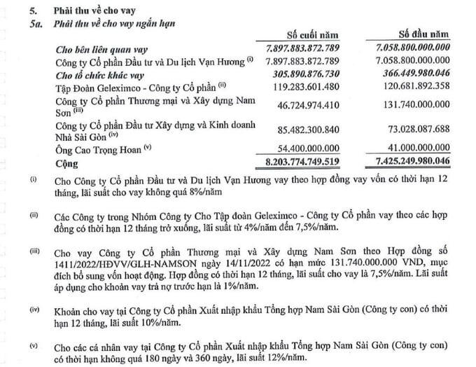 Bên cạnh đó, công ty này cũng cho Vạn Hương Investoco vay dài hạn 5.833,7 tỷ đồng. Đây là khoản cho vay theo 2 hợp đồng vay vốn năm 2023 với tổng hạn mức 10.000 tỷ đồng; lãi suất áp dụng cho năm 2023 là 7,42%/năm.