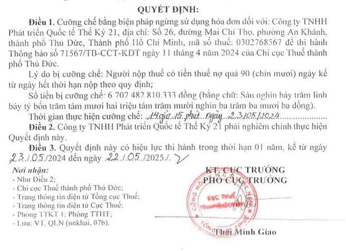 Cục thuế TP. HCM đã ban hành Quyết định số 1003/QĐ-CT-CC, ngày 23/5/2024, về việc cưỡng chế thi hành quyết định hành chính về quản lý thuế bằng biện pháp ngừng sử dụng hóa đơn đối với Công ty TNHH Phát triển Quốc tế Thế kỷ 21 (Công ty Thế kỷ 21) do nợ thuế.