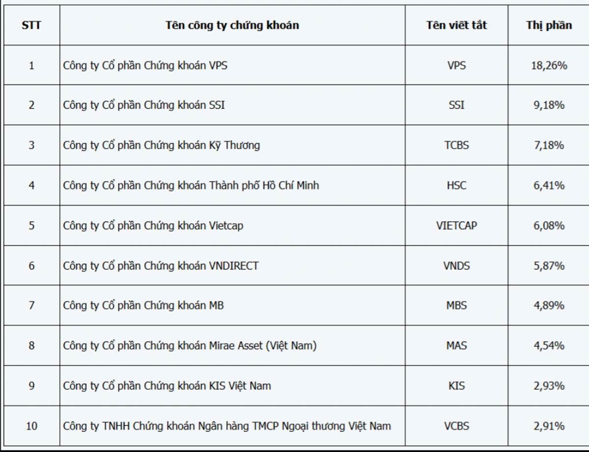 4 vị trí còn lại trong top 10 là 2 công ty có vốn của Hàn Quốc và 2 công ty thuộc ngân hàng. Đó là Chứng khoán MB, Chứng khoán Mirae Asset (Việt Nam), Chứng khoán KIS Việt Nam, Chứng khoán Ngân hàng TMCP Ngoại thương Việt Nam (VCBS).