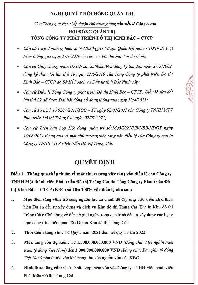 Nghị quyết thông qua việc chấp thuận tăng vốn điều lệ Công ty con (Nguồn: KBC).