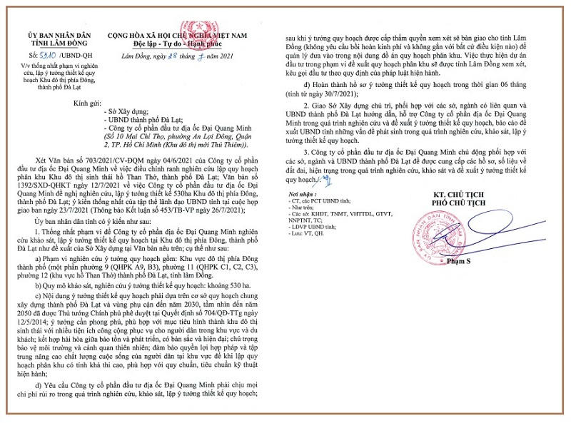 Văn bản cũng nêu rõ, Đại Quang Minh phải chịu mọi chi phí rủi ro trong quá trình nghiên cứu, khảo sát, lập ý tưởng thiết kế quy hoạch và toàn thành hồ sơ ý tưởng thiết kế quy hoạch trong thời gian 6 tháng, tính từ ngày 30/7.