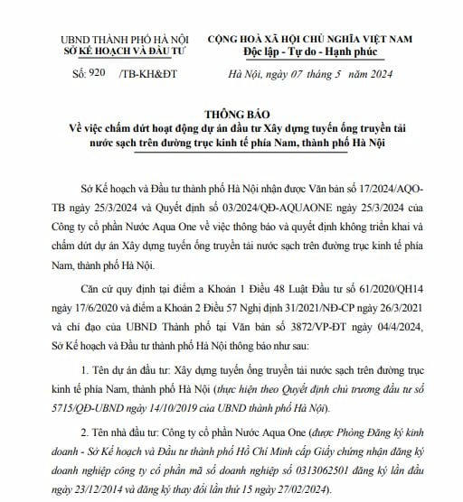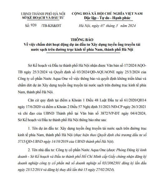 Sở Kế hoạch và Đầu tư thành phố Hà Nội nhận được Văn bản số 17/2024/AQO- TB ngày 25/3/2024 và Quyết định số 03/2024/QĐ-AQUAONE ngày 25/3/2024 của Công ty cổ phần Nước Aqua One về việc thông báo và quyết định không triển khai và chấm dứt dự án Xây dựng tuyến ống truyền tải nước sạch trên đường trục kinh tế phía Nam, TP. Hà Nội.