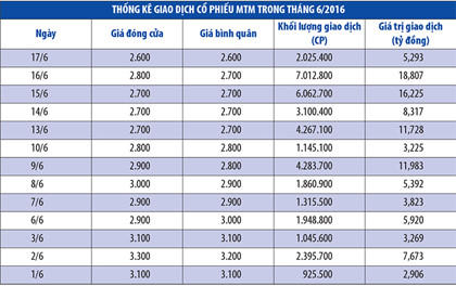 Trước khi bị tạm ngừng giao dịch kể từ ngày 20/6, cổ phiếu MTM có khối lượng giao dịch hàng triệu đơn vị/phiên (xem bảng). Những nhà đầu tư tham gia mua cổ phiếu MTM thời gian qua đang bị “mắc kẹt”.