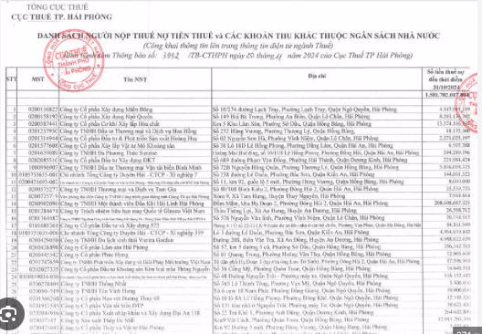Theo danh sách kèm Thông báo số 3992/TB-CTHPH, Cục Thuế TP. Hải Phòng công khai 709 doanh nghiệp, tổ chức còn nợ tiền thuế và các khoản thu khác thuộc ngân sách nhà nước tính đến ngày 31/10/2024 với tổng số tiền là hơn 1.581 tỷ đồng.