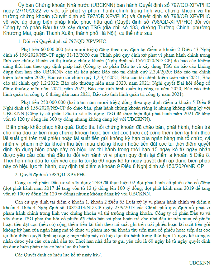Cụ thể, tại Quyết định số 797/QĐ-XPVPHC, phạt tiền 60 triệu đồng theo quy định tại điểm a khoản 2 Điều 43 Nghị định số 156/2020/NĐ-CP ngày 31/12/2020 của Chính phủ quy định xử phạt vi phạm hành chính trong lĩnh vực chứng khoán và thị trường chứng khoán (Nghị định số 156/2020/NĐ-CP) do báo cáo không đúng thời hạn theo quy định pháp luật (Công ty cổ phần Đầu tư và xây dựng TSG đã báo cáo không đúng thời hạn cho UBCKNN các tài liệu gồm: Báo cáo tài chính quý 2,3,4/2020; Báo cáo tài chính kiểm toán năm 2020; Báo cáo tài chính quý 1,2,3,4/2021; Báo cáo tài chính kiểm toán năm 2021; Báo cáo tài chính quý 1,2/2022; Báo cáo thường niên năm 2020, năm 2021; Nghị quyết Đại hội đồng cổ đông thường niên năm 2021, năm 2022; Báo cáo tình hình quản trị công ty năm 2020, Báo cáo tình hình quản trị công ty 6 tháng đầu năm 2021, Báo cáo tình hình quản trị công ty năm 2021).